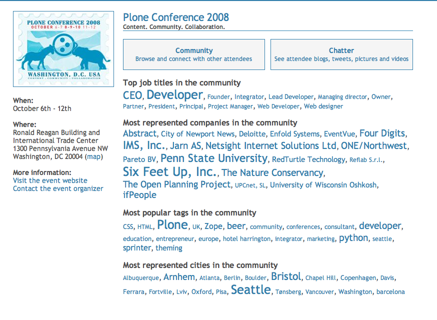 Seattle is still the most represented city in the Plone 2008 conference’s EventVue page. Bristol, UK nearly spanked us, but a couple of new entries from Seattle’s contingent enabled us to maintain the first-place position.