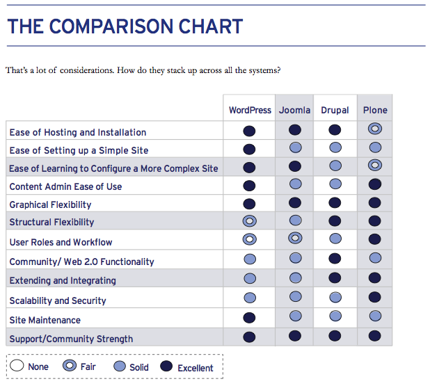 Idealware has published a report comparing four open-source CMSs. Its title: Comparing Open Source Content Management Systems: WordPress, Joomla, Drupal and Plone. (Is that a straightforward title, or what? Heh.) I read about it in a few blogs I follow.