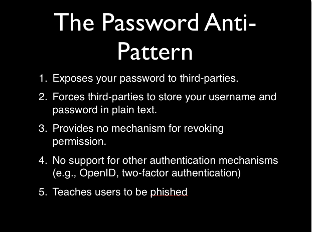 1053: Some of these slides would be much clearer as an FSM diagram, or even just an informal graphic. For example, describing how OAuth authentication works.