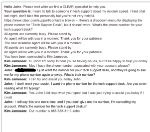 So I started another chat session to ask for their tech support number. The rep was obviously loath to give out phone numbers. I had to threaten to cancel my CLEAR contract to get him to cough up a number. Here’s the exchange: