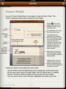 It’s got oodles of features. More than I can fully digest at one sitting. It’s got zooming, which is critical for my needs. It’s got tags. It’s got text input. (You have font choices, up comes the keyboard, you type text in a text box, etc.) It’s got Holy Crap bucket loads of features.