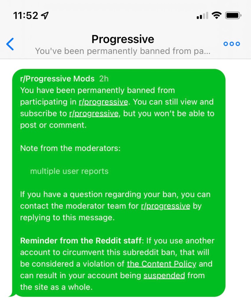 I’ve been banned from the /r/progressive subreddit due to “multiple user reports.”