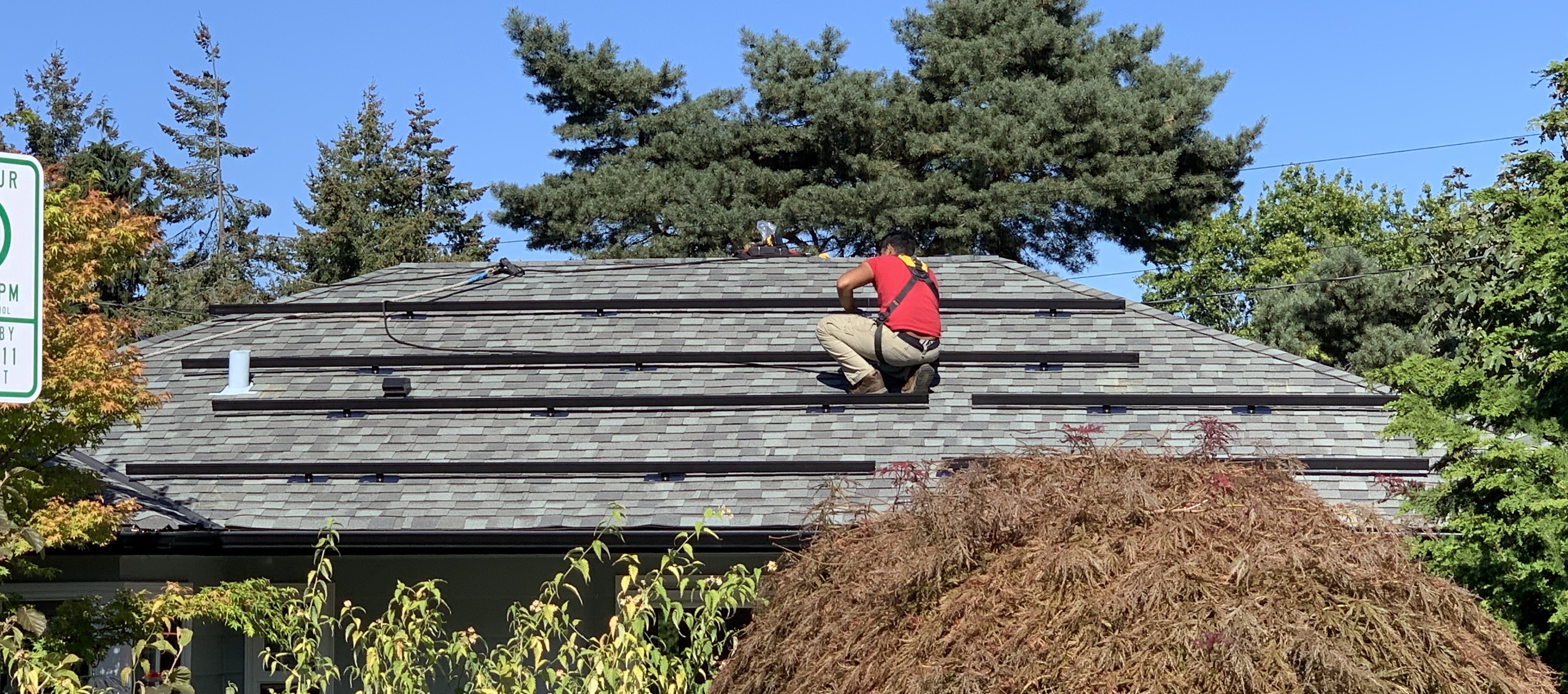 They installed most of the roof mounts, which involved a lot of whacking on the roof to locate the rafters. I guess a gizmo doesn’t yet exist to find rafters using density-scanning like some interior stud-finders. Guess it takes a bit more power to look through layers of roof shingles!