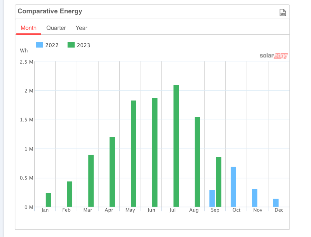 SolarEdge doesn’t provide a “past N days” graph, so you have to do some mental gymnastics. The production starts at the first blue column in September, goes to the end of the graph on the right, wraps around to the left side of the graph in January 2023, and then ends in September 2023.