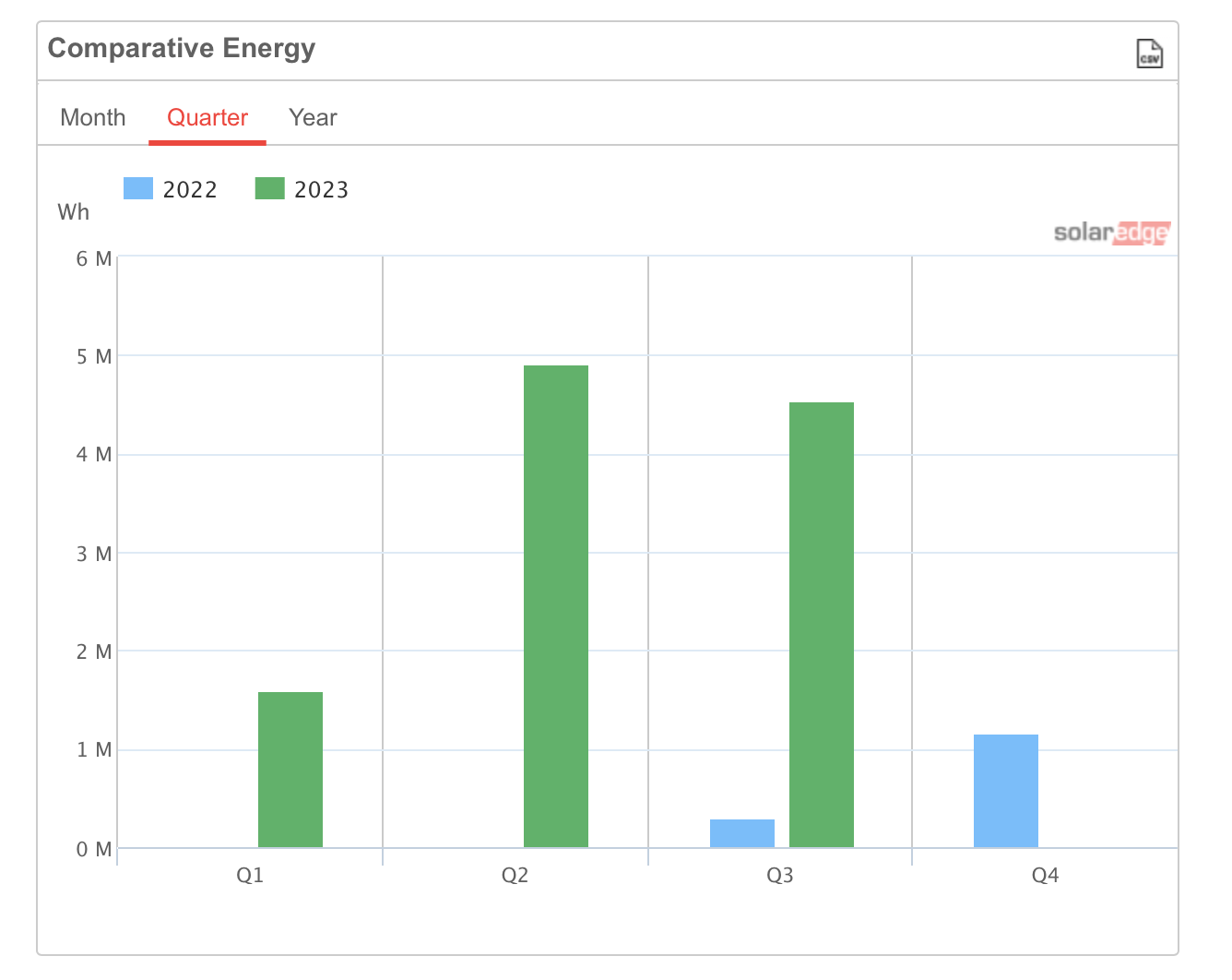 While the energy of Q3Y2022 + Q3Y2023 is close to the Q2 production, the monthly production surprised me. I expected June to be the high month since it contains the longest day of the year. Nope! Cloudy and rainy days, and forest fire haze, prevented that. July was the highest monthly production, with a significant reduction in August.
