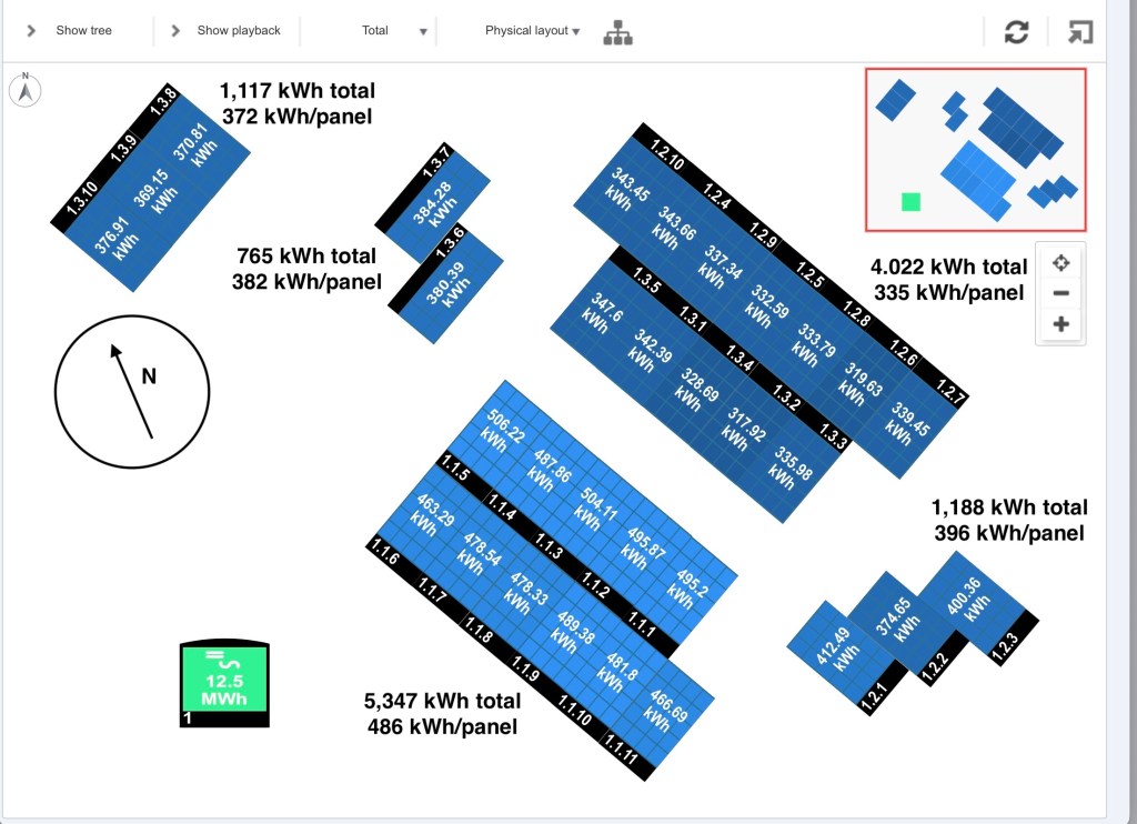 I was also surprised by the strong showing of the three panels near our chimney — they’re in the lower-right corner. They are mostly south-facing, but I expected the chimney’s shadow would eliminate that advantage. Nope, they kicked butt.