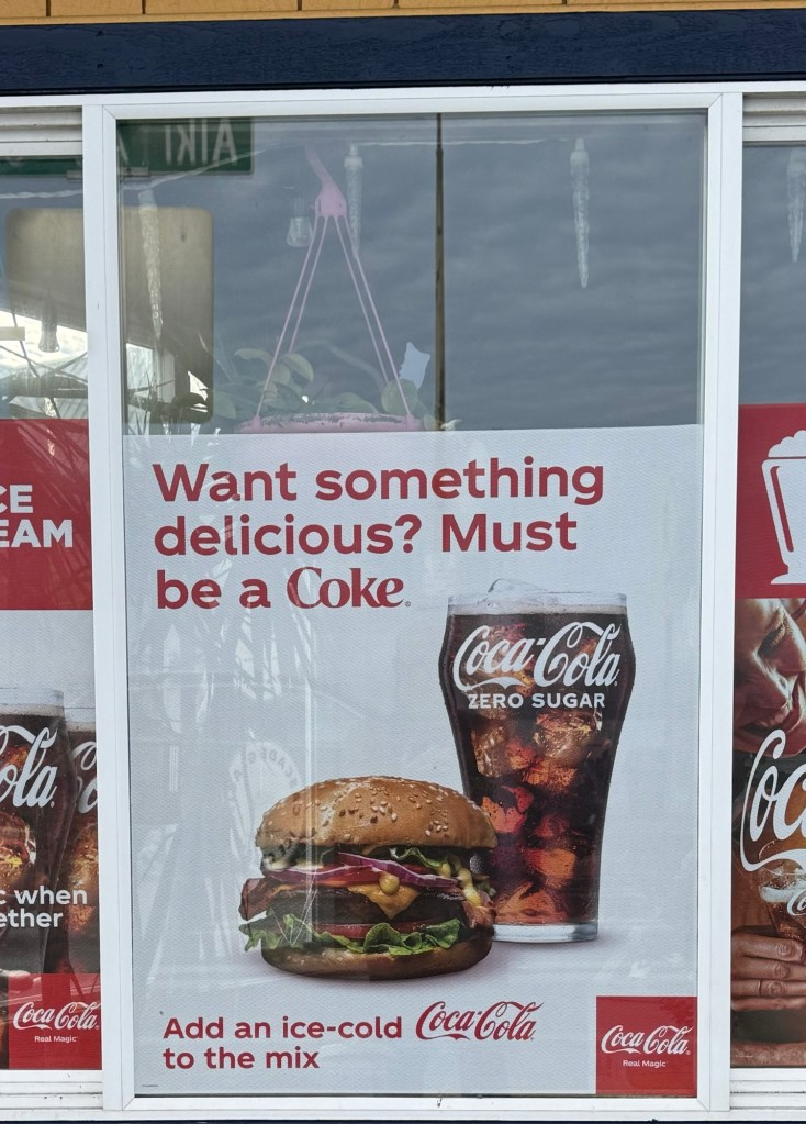 Have a Coca-Cola Zero Sugar to go along with your mega cheeseburger with all the fixings. Left unstated is the likelihood of french fries on the side.